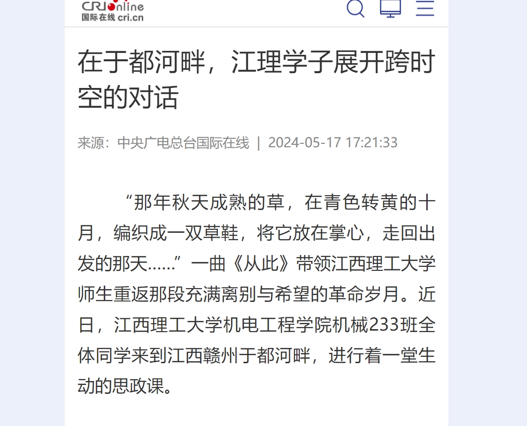 “那年秋天成熟的草,在青色转黄的十月,编织成一双草鞋,将它放在掌心,走回出发的那天……”一曲《从此》带领江西理工大学师生重返那段充满离别与希望的革命岁月。近日,江西理工大学机电工程学院机械233班全体同学来到江西赣州于都河畔,进行着一堂生动的思政课。