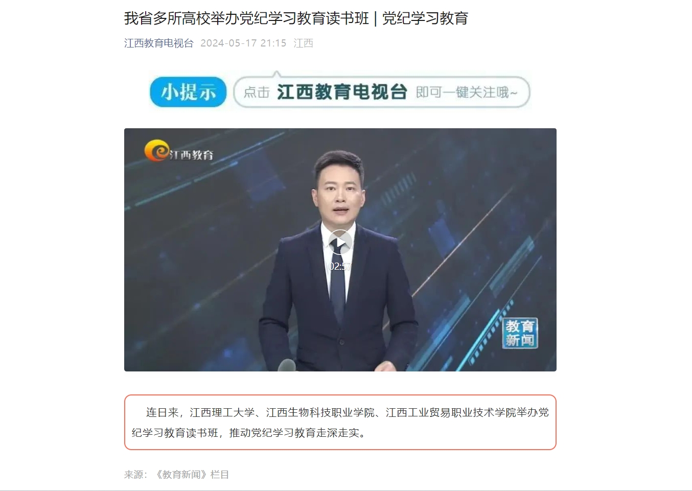 《江西教育电视台》:我省多所高校举办党纪学习教育读书班 | 党纪学习教育