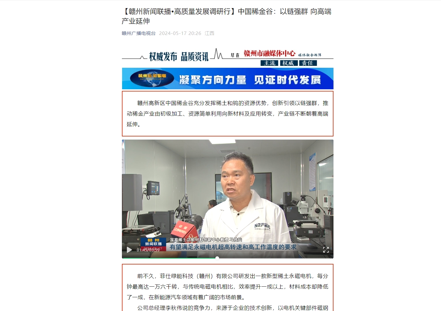 前不久,菲仕绿能科技(赣州)有限公司研发出一款新型稀土永磁电机,每分钟最高达一万六千转,与传统电磁电机相比,效率提升一成以上,材料成本却降低了一成,在新能源汽车领域有着广阔的市场前景。