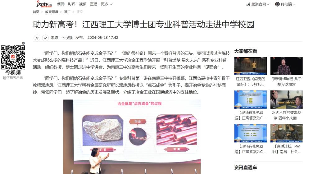 “同学们,你们相信石头能变成金子吗?”“真的很神奇!原来一个看似普通的石头,竟可以通过冶炼技术变成那么多的高科技产品!”近日,江西理工大学冶金工程学院开展“科普燃梦·星火未来”系列专业科普活动,组织教授、博士团走进中学讲台,为南康三中准高考生们带来一场别开生面的专业科普“见面会”。