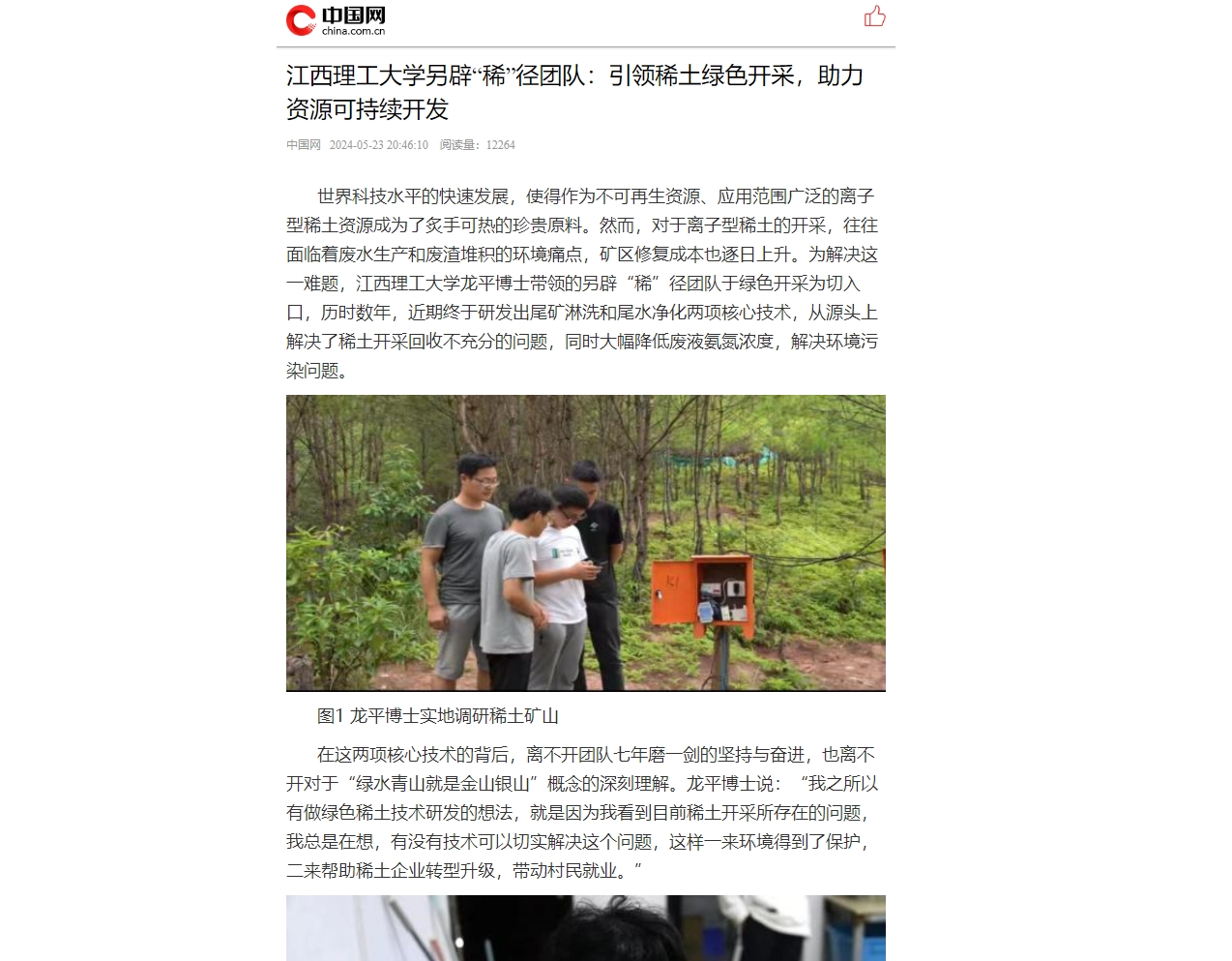 世界科技水平的快速发展,使得作为不可再生资源、应用范围广泛的离子型稀土资源成为了炙手可热的珍贵原料。然而,对于离子型稀土的开采,往往面临着废水生产和废渣堆积的环境痛点,矿区修复成本也逐日上升。为解决这一难题,江西理工大学龙平博士带领的另辟“稀”径团队于绿色开采为切入口,历时数年,近期终于研发出尾矿淋洗和尾水净化两项核心技术,从源头上解决了稀土开采回收不充分的问题,同时大幅降低废液氨氮浓度,解决环境污染问题。