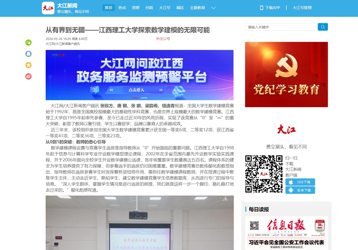大江网/大江新闻客户端讯张琼方、唐 朝、张 鹏、梁韵希、钱逸青报道:全国大学生数学建模竞赛始于1992年,既是全国高校规模最大的基础性学科竞赛,也是世界上规模最大的数学建模竞赛。江西理工大学自1995年起率先参赛,至今已走过近30年的风雨历程,实现了该竞赛从“0”至“∞”的重大突破,彰显了教师以赛引领、学生以赛促学、品牌以赛育人的卓越成效。
