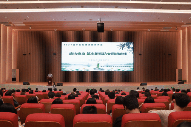 江西新闻客户端讯(张海燕 曾至炜)近日,江西理工大学为毕业学子举行了一场别开生面的离校教育。在江西理工大学三江校区志远会议中心1号厅,江西理工大学经济管理学院2024届全体毕业生齐聚一堂,江西省药学会医院药学专业委员会副主任委员徐小军在这里开展以“奔赴山海 不负热爱”为题的廉洁教育。通过鲜活生动的廉政教育为学子筑牢廉政之魂,用“三维六方”红色育人体系为学子扎牢理想信念的根。