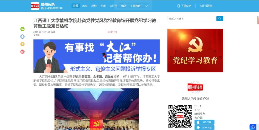 大江网/赣州头条客户端讯 通讯员曾亮亮、余孝甜、饶先发报道: 6月11日下午,江西理工大学能机学院党委组织学院师生党员前往江西省党性党风党纪教育馆开展现场警示教育活动。该校党委常委、副校长黄志繁出席、能机学院党委书记饶先发、副院长薛锦春、副院长李亮星带队参加活动。