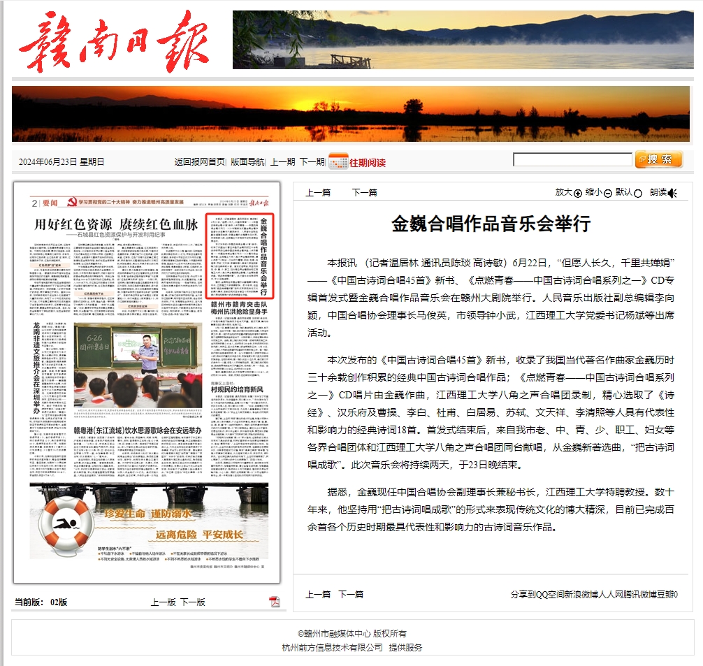 据悉,金巍现任中国合唱协会副理事长兼秘书长,江西理工大学特聘教授。数十年来,他坚持用“把古诗词唱成歌”的形式来表现传统文化的博大精深,目前已完成百余首各个历史时期最具代表性和影响力的古诗词音乐作品。