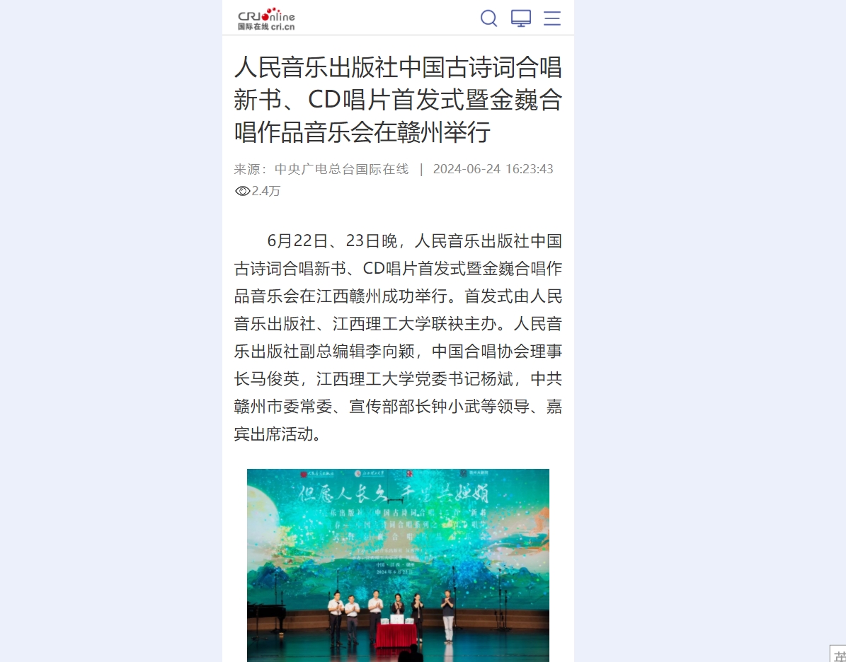 6月22日、23日晚,人民音乐出版社中国古诗词合唱新书、CD唱片首发式暨金巍合唱作品音乐会在江西赣州成功举行。首发式由人民音乐出版社、江西理工大学联袂主办。人民音乐出版社副总编辑李向颖,中国合唱协会理事长马俊英,江西理工大学党委书记杨斌,中共赣州市委常委、宣传部部长钟小武等领导、嘉宾出席活动。