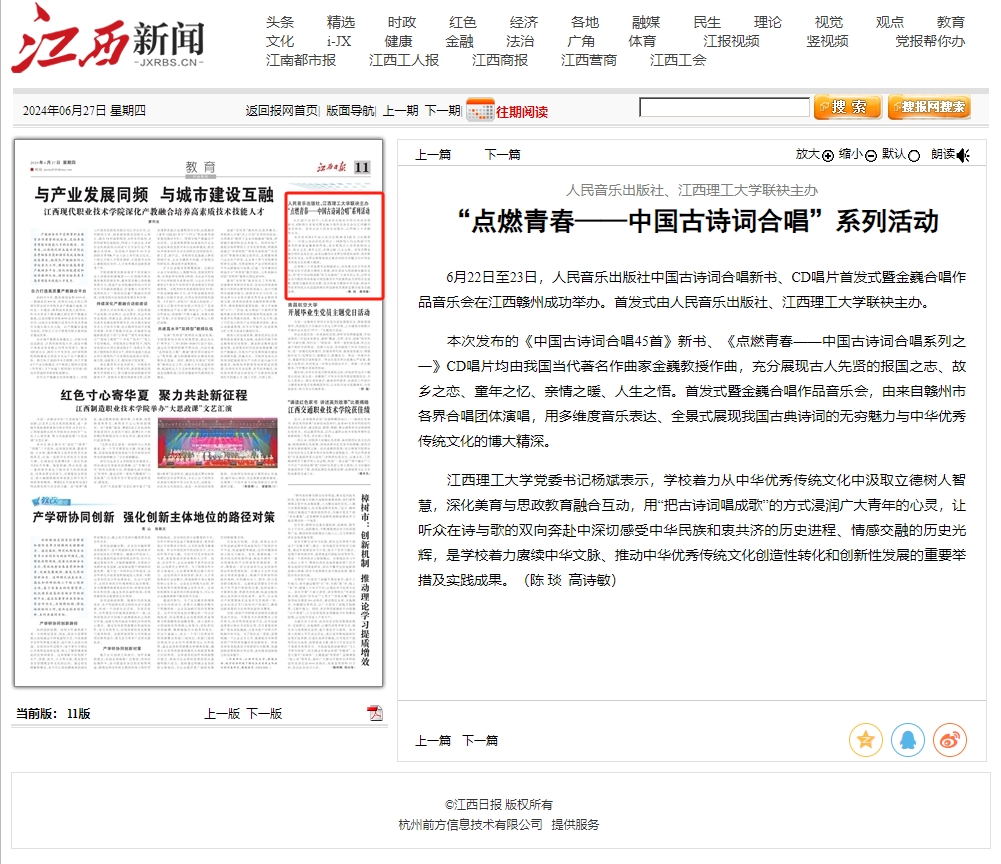 《江西日报》:人民音乐出版社、江西理工大学联袂主办 “点燃青春——中国古诗词合唱”系列活动