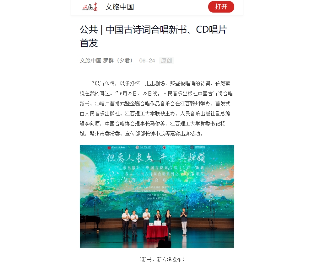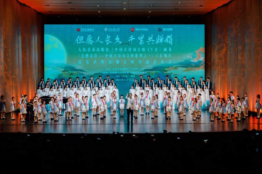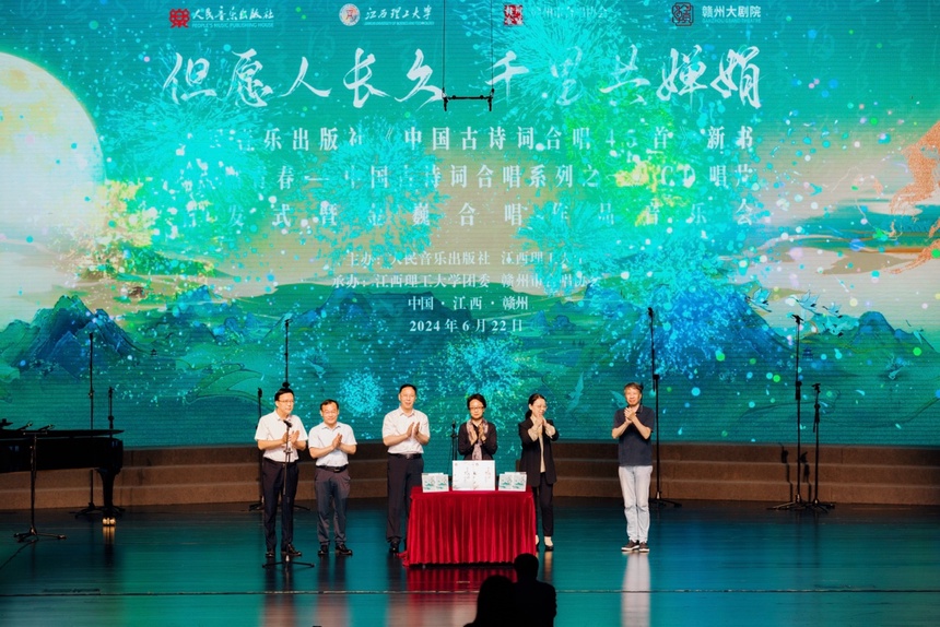 “以诗传情,以乐抒怀,走出剧场,那些被唱诵的诗词,依然萦绕在我的耳边。”6月22日、23日晚,人民音乐出版社中国古诗词合唱新书、CD唱片首发式暨金巍合唱作品音乐会在江西赣州举办。首发式由人民音乐出版社、江西理工大学联袂主办。人民音乐出版社副总编辑李向颖,中国合唱协会理事长马俊英,江西理工大学党委书记杨斌,赣州市委常委、宣传部部长钟小武等嘉宾出席活动。