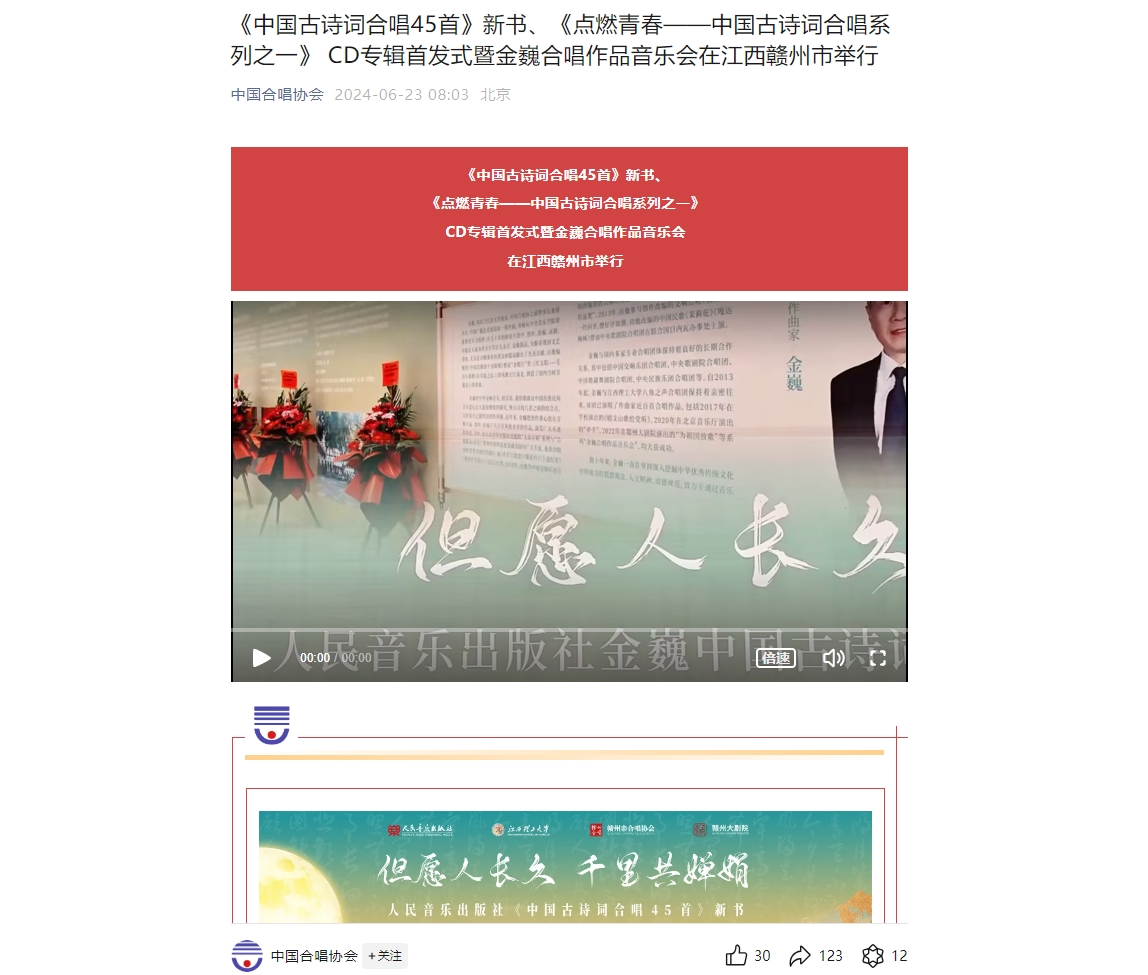 2024年6月22日,《中国古诗词合唱45首》新书、《点燃青春——中国古诗词合唱系列之一》 CD专辑首发式暨金巍合唱作品音乐会在江西赣州市成功举办。中国合唱协会理事长马俊英、江西理工大学党委书记杨斌、人民音乐出版社副总编辑李向颖、中共赣州市委常委、宣传部部长钟小武等嘉宾出席活动。