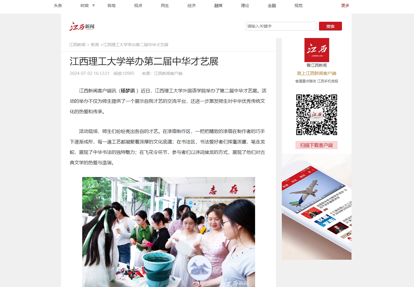 江西新闻客户端讯(杨梦琪)近日,江西理工大学外国语学院举办了第二届中华才艺展。活动的举办不仅为师生提供了一个展示自我才艺的交流平台,还进一步激发师生对中华优秀传统文化的热爱和传承。