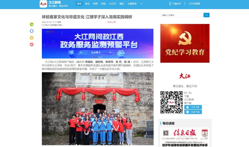 大江网/大江新闻客户端讯(通讯员郑德森、谢昀希、钟荣萍、张 丹、陈 澜)近日,江西理工大学马克思主义学院“志远·笃行”青年志愿服务实践队走进龙南市杨村镇开展调研,实践队队员体验了杨村镇独特的民俗特色和浓厚的客家风情,开启了一次难忘的文化之旅。