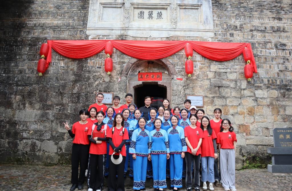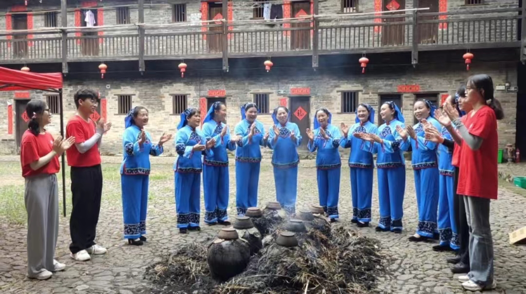 实践队探访了具有深厚历史底蕴的燕翼围,对围屋的精巧布局、实用功能和文化内涵有了更深的理解,体会到了客家人在艰苦环境中展现出的生存智慧。与当地客家山歌队学唱敬酒歌、拎包歌和欢迎歌等传统客家山歌、参与客家山歌传承演绎拍摄,展现出江理学子的青春风采。