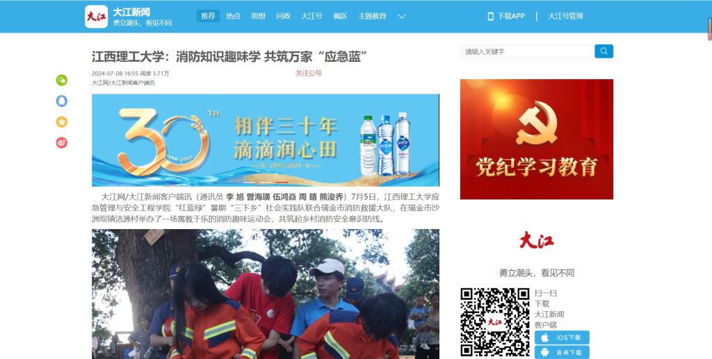 大江网/大江新闻客户端讯(通讯员李 旭 曾海瑛 伍鸿焱 周 晴 熊浚乔)7月5日,江西理工大学应急管理与安全工程学院“红蓝绿”暑期“三下乡”社会实践队联合瑞金市消防救援大队,在瑞金市沙洲坝镇洁源村举办了一场寓教于乐的消防趣味运动会,共筑起乡村消防安全意识防线。