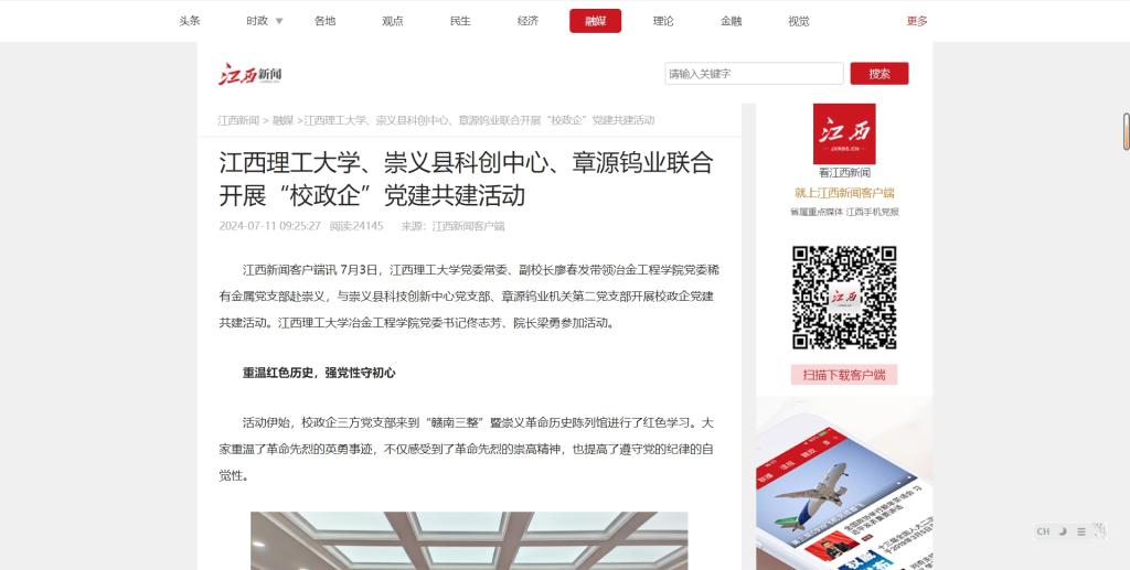江西新闻客户端讯 7月3日,江西理工大学党委常委、副校长廖春发带领冶金工程学院党委稀有金属党支部赴崇义,与崇义县科技创新中心党支部、章源钨业机关第二党支部开展校政企党建共建活动。江西理工大学冶金工程学院党委书记佟志芳、院长梁勇参加活动。