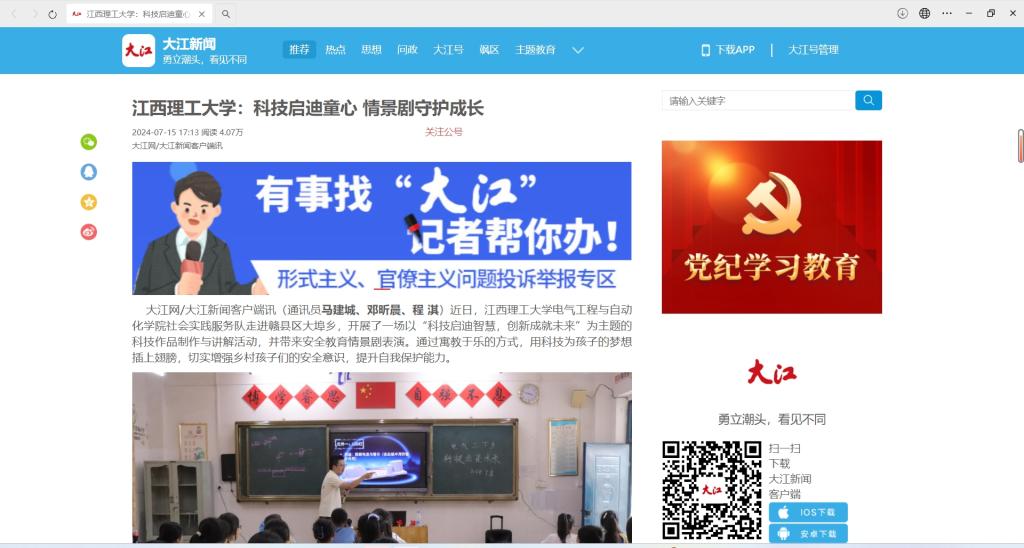 大江网/大江新闻客户端讯(通讯员马建城、邓昕晨、程 淇)近日,江西理工大学电气工程与自动化学院社会实践服务队走进赣县区大埠乡,开展了一场以“科技启迪智慧,创新成就未来”为主题的科技作品制作与讲解活动,并带来安全教育情景剧表演。通过寓教于乐的方式,用科技为孩子的梦想插上翅膀,切实增强乡村孩子们的安全意识,提升自我保护能力。