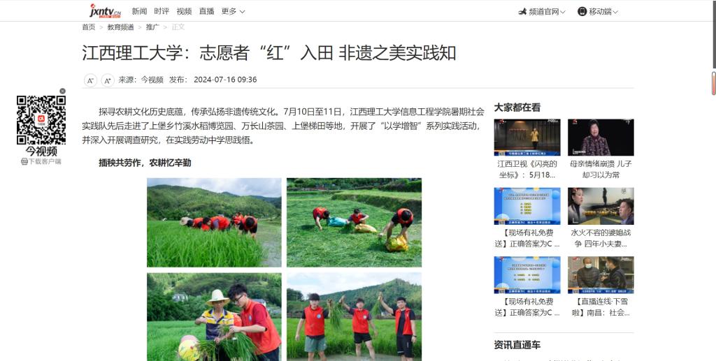 探寻农耕文化历史底蕴,传承弘扬非遗传统文化。7月10日至11日,江西理工大学信息工程学院暑期社会实践队先后走进了上堡乡竹溪水稻博览园、万长山茶园、上堡梯田等地,开展了“以学增智”系列实践活动,并深入开展调查研究,在实践劳动中学思践悟。