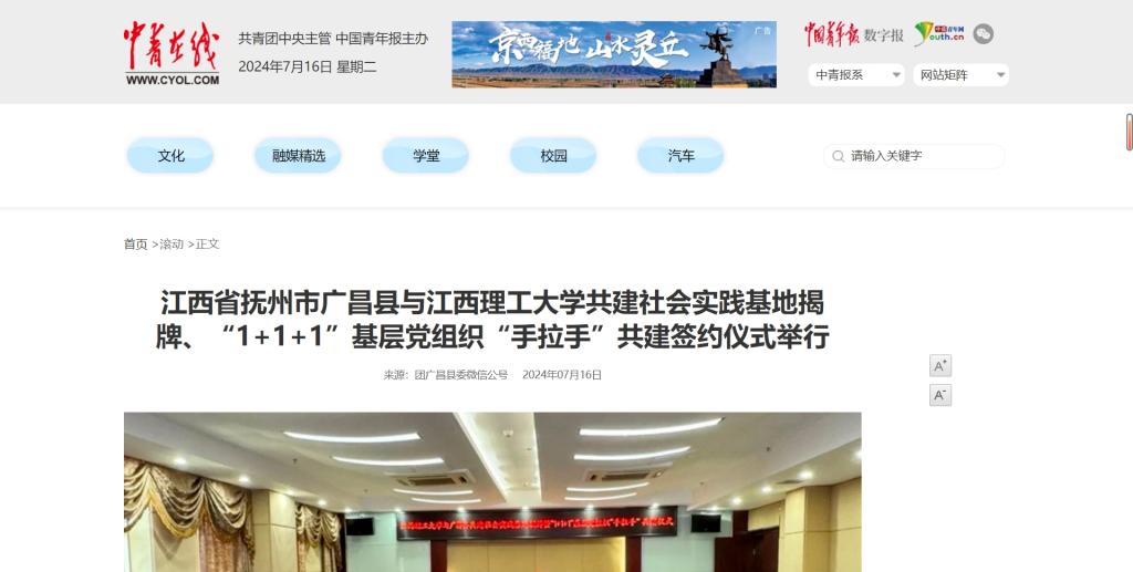 7月15日,江西理工大学与广昌县共建社会实践基地揭牌、“1+1+1”基层党组织“手拉手”共建签约仪式举行,县委书记吴自胜,江西理工大学校党委委员、工会主席余育新出席并致辞,江西理工大学能源与机械工程学院党委书记饶先发及晁云等学院领导出席,县委常委、宣传部部长林必茂主持,副县长黄懿,江西省广德环保科技有限公司董事长罗天贵,县委人才办、旴江镇、县工业园区管委会、科技局、团县委等主要负责同志以及学院暑期社会实践队全体成员参加。