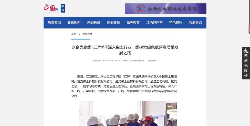 近日,江西理工大学冶金工程学院“红炉”实践队的同学们深入中国稀土集团赣州友力稀土科技开发有限公司、晨光稀土新材料有限公司,通过走访调研、校友访谈、一线学习等方式,结合冶金工程专业、新能源科学与工程专业特色,深入产业一线,产学融合,围绕绿色发展、产线升级探索稀土企业的绿色低碳高质量发展之路。
