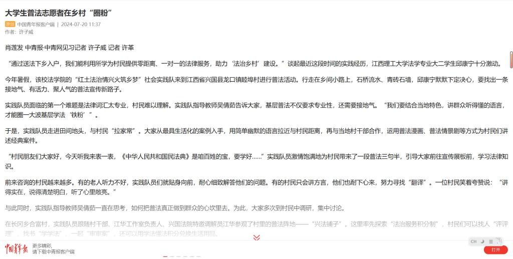 “通过送法下乡入户,我们能利用所学为村民提供零距离、一对一的法律服务,助力‘法治乡村’建设。”谈起最近这段时间的实践经历,江西理工大学法学专业大二学生邱康宁十分激动。