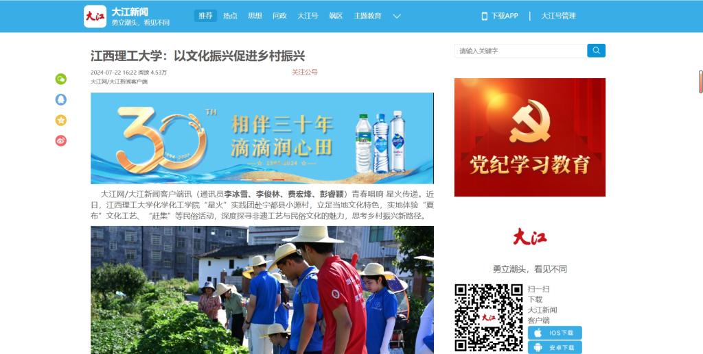 大江网/大江新闻客户端讯(通讯员李冰雪、李俊林、费宏烽、彭睿颖)青春唱响 星火传递。近日,江西理工大学化学化工学院“星火”实践团赴宁都县小源村,立足当地文化特色,实地体验“夏布”文化工艺、“赶集”等民俗活动,深度探寻非遗工艺与民俗文化的魅力,思考乡村振兴新路径。