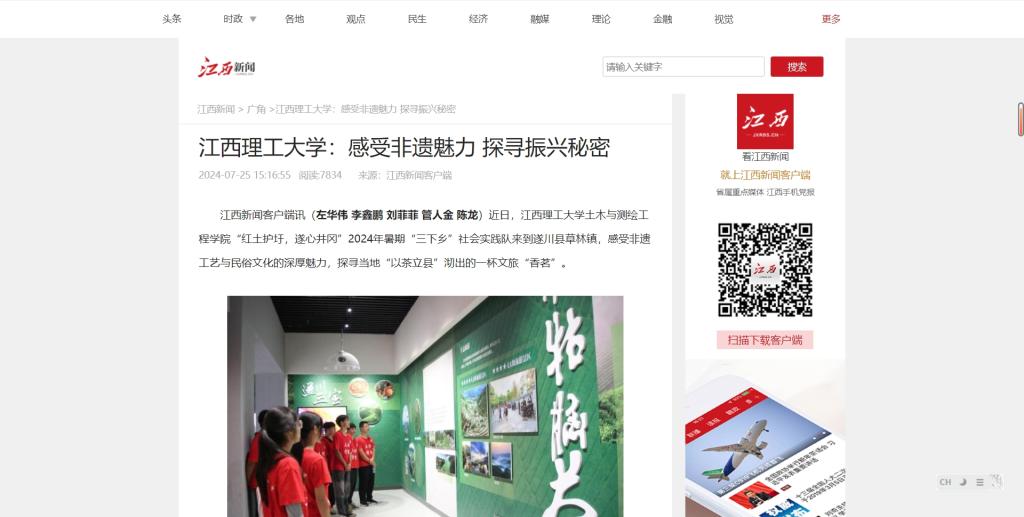 江西新闻客户端讯(左华伟 李鑫鹏 刘菲菲 管人金 陈龙)近日,江西理工大学土木与测绘工程学院“红土护圩,遂心井冈”2024年暑期“三下乡”社会实践队来到遂川县草林镇,感受非遗工艺与民俗文化的深厚魅力,探寻当地“以茶立县”沏出的一杯文旅“香茗”。
