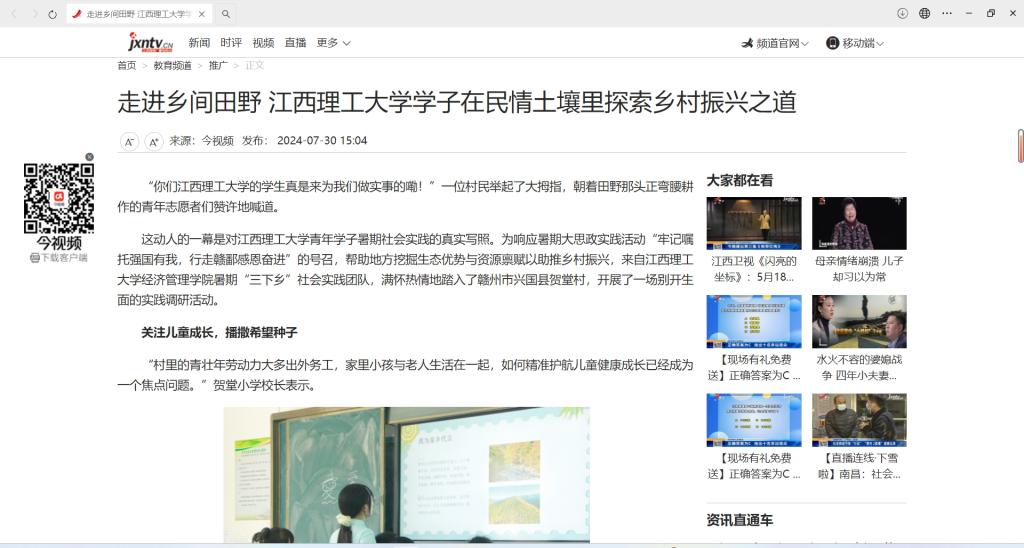 这动人的一幕是对江西理工大学青年学子暑期社会实践的真实写照。为响应暑期大思政实践活动“牢记嘱托强国有我,行走赣鄱感恩奋进”的号召,帮助地方挖掘生态优势与资源禀赋以助推乡村振兴,来自江西理工大学经济管理学院暑期“三下乡”社会实践团队,满怀热情地踏入了赣州市兴国县贺堂村,开展了一场别开生面的实践调研活动。