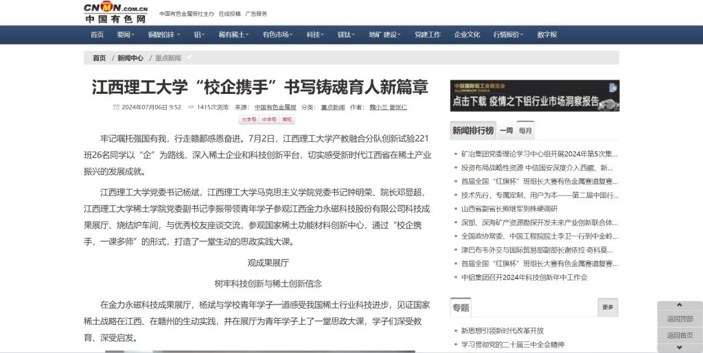 江西理工大学党委书记杨斌,江西理工大学马克思主义学院党委书记钟明荣、院长邓显超,江西理工大学稀土学院党委副书记李振带领青年学子参观江西金力永磁科技股份有限公司科技成果展厅、烧结炉车间,与优秀校友座谈交流,参观国家稀土功能材料创新中心,通过“校企携手,一课多师”的形式,打造了一堂生动的思政实践大课。