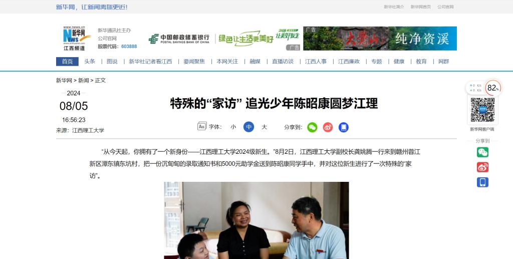 “从今天起,你拥有了一个新身份——江西理工大学2024级新生。”8月2日,江西理工大学副校长龚姚腾一行来到赣州蓉江新区潭东镇东坑村,把一份沉甸甸的录取通知书和5000元助学金送到陈昭康同学手中,并对这位新生进行了一次特殊的“家访”。