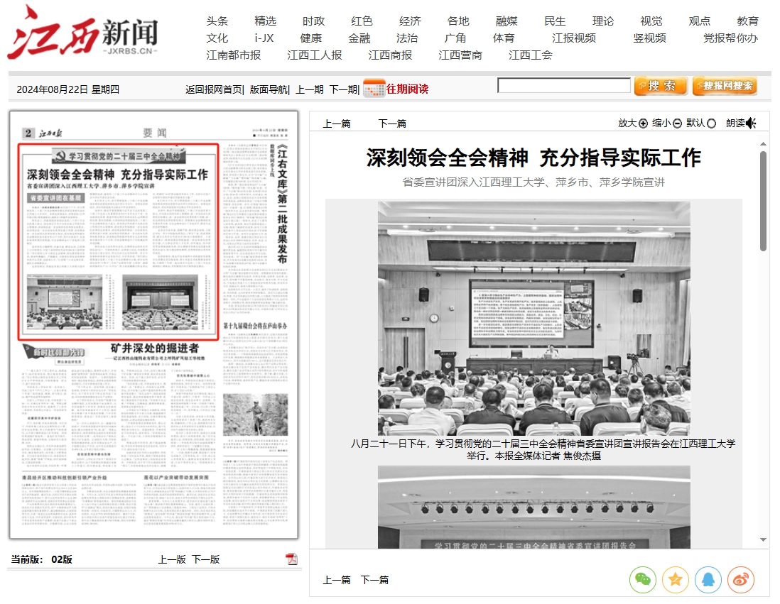 八月二十一日下午,学习贯彻党的二十届三中全会精神省委宣讲团宣讲报告会在江西理工大学举行。本报全媒体记者 焦俊杰摄