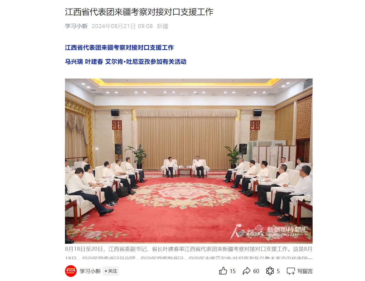 8月18日至20日,江西省委副书记、省长叶建春率江西省代表团来新疆考察对接对口支援工作。这是8月18日,自治区党委书记马兴瑞,自治区党委副书记、自治区主席艾尔肯·吐尼亚孜在乌鲁木齐会见代表团一行。石榴云/新疆日报记者 崔志坚摄