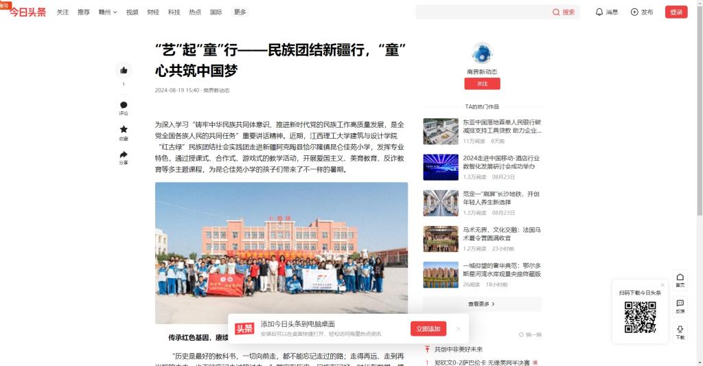 为深入学习“铸牢中华民族共同体意识、推进新时代党的民族工作高质量发展,是全党全国各族人民的共同任务”重要讲话精神。近期,江西理工大学建筑与设计学院“红古绿”民族团结社会实践团走进新疆阿克陶县恰尔隆镇昆仑佳苑小学,发挥专业特色,通过授课式、合作式、游戏式的教学活动,开展爱国主义、美育教育、反诈教育等多主题课程,为昆仑佳苑小学的孩子们带来了不一样的暑期。