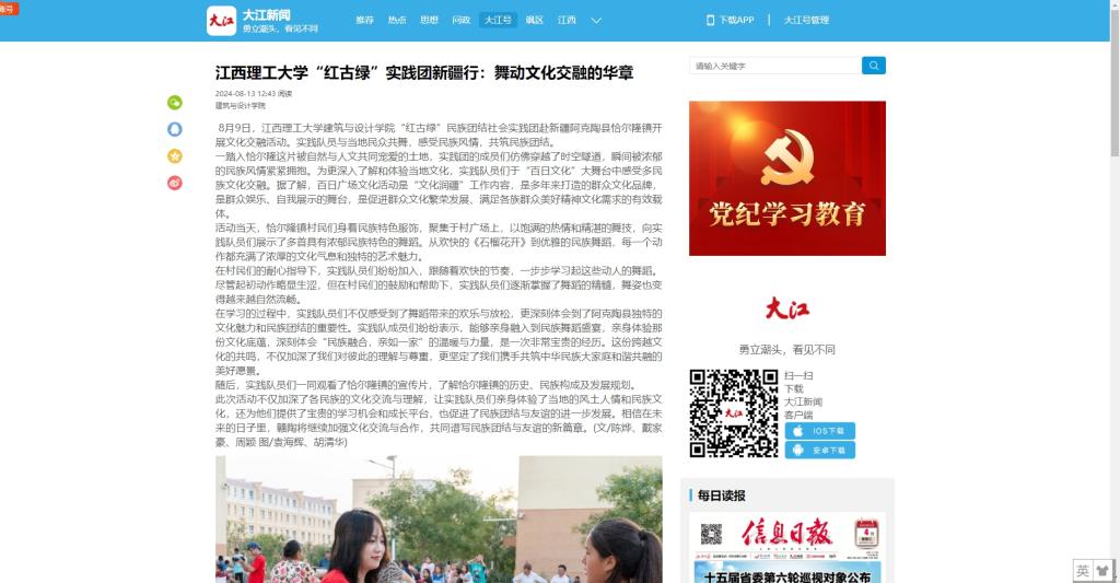 8月9日,江西理工大学建筑与设计学院“红古绿”民族团结社会实践团赴新疆阿克陶县恰尔隆镇开展文化交融活动。实践队员与当地民众共舞,感受民族风情,共筑民族团结。