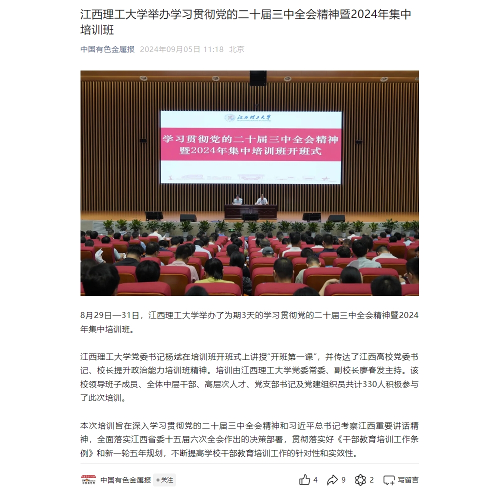 8月29日—31日,江西理工大学举办了为期3天的学习贯彻党的二十届三中全会精神暨2024年集中培训班。
