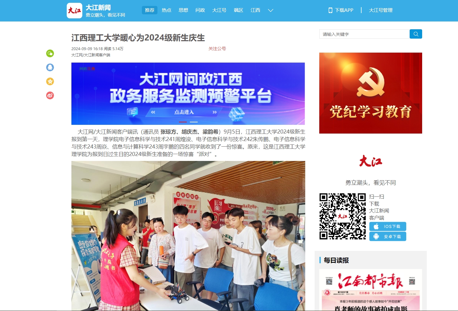 大江网/大江新闻客户端讯(通讯员张琼方、胡庆杰、梁韵希)9月5日,江西理工大学2024级新生报到第一天,理学院电子信息科学与技术241周煌浚、电子信息科学与技术242朱传鹏、电子信息科学与技术243周焱、信息与计算科学243周宇鹏的四名同学就收到了一份惊喜。原来,这是江西理工大学理学院为报到日过生日的2024级新生准备的一场惊喜“派对”。