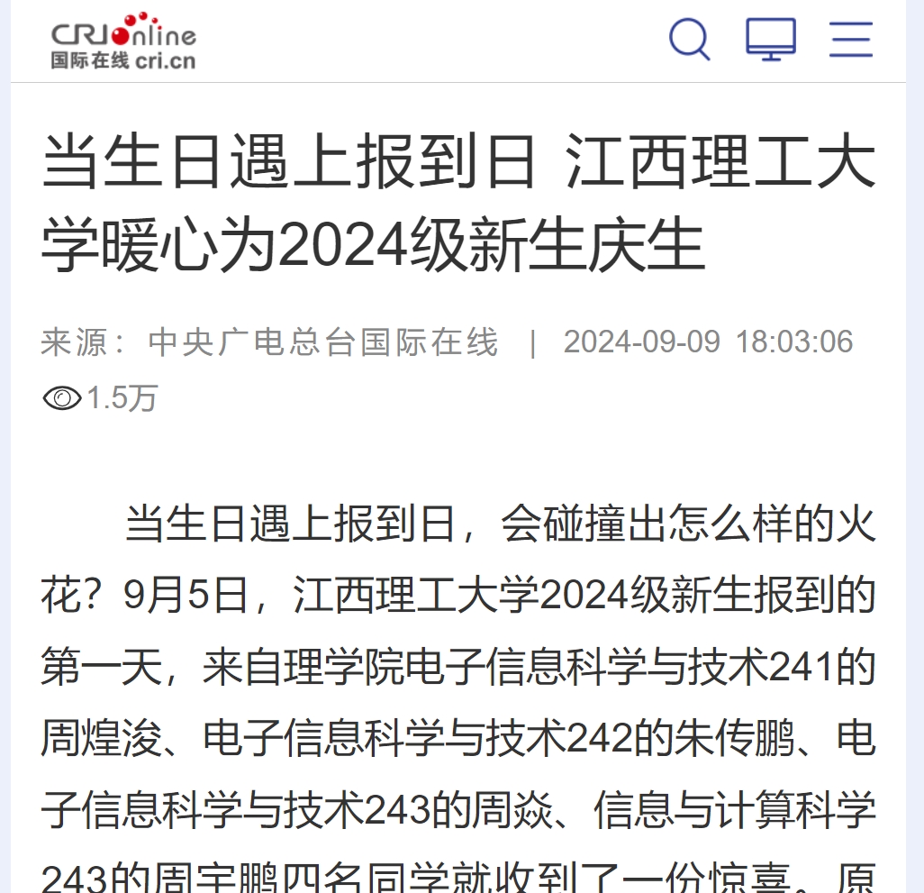 当天过生日的周焱说:“这是我在江西理工大学过的第一个生日,也是最难忘的生日。学校把学子当作是自己的孩子一样,希望自己可以在充满温情与关爱的校园里,发光发热,不断成长!”周煌浚说,“刚来到江西理工大学,对于老师和同学都还有点陌生的时候,全学院同学为我庆生,收到大家的生日祝福,感觉一下子就融入江理大家庭了!”