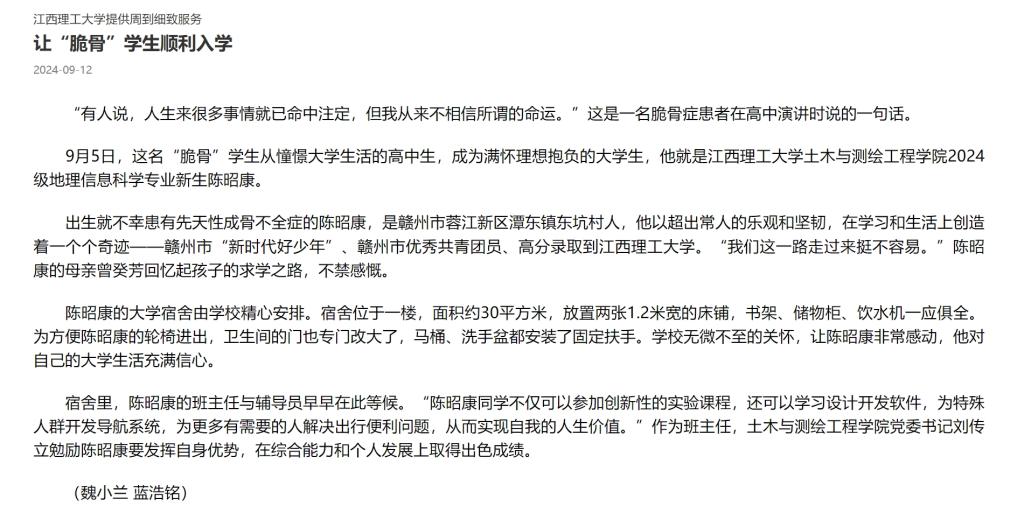 出生就不幸患有先天性成骨不全症的陈昭康,是赣州市蓉江新区潭东镇东坑村人,他以超出常人的乐观和坚韧,在学习和生活上创造着一个个奇迹——赣州市“新时代好少年”、赣州市优秀共青团员、高分录取到江西理工大学。“我们这一路走过来挺不容易。”陈昭康的母亲曾癸芳回忆起孩子的求学之路,不禁感慨。