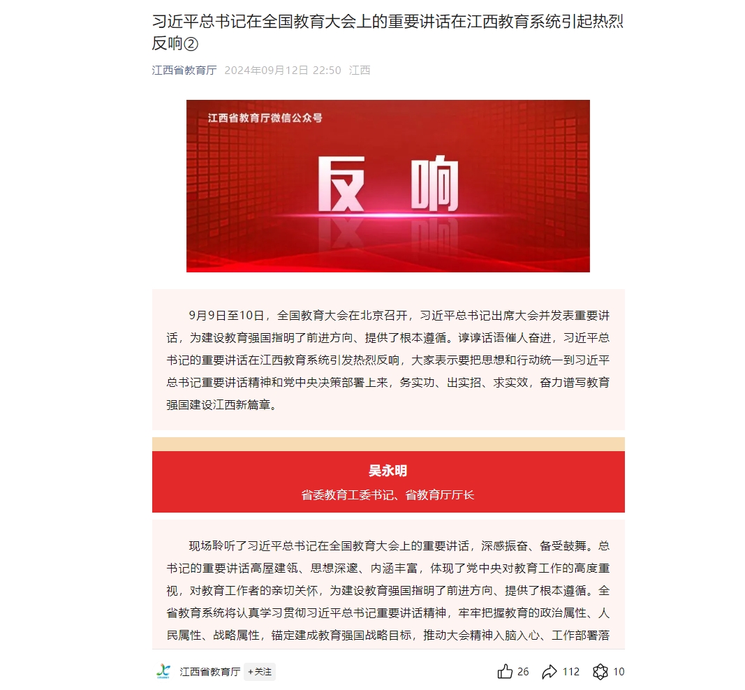 9月9日至10日,全国教育大会在北京召开,习近平总书记出席大会并发表重要讲话,为建设教育强国指明了前进方向、提供了根本遵循。谆谆话语催人奋进,习近平总书记的重要讲话在江西教育系统引发热烈反响,大家表示要把思想和行动统一到习近平总书记重要讲话精神和党中央决策部署上来,务实功、出实招、求实效,奋力谱写教育强国建设江西新篇章。