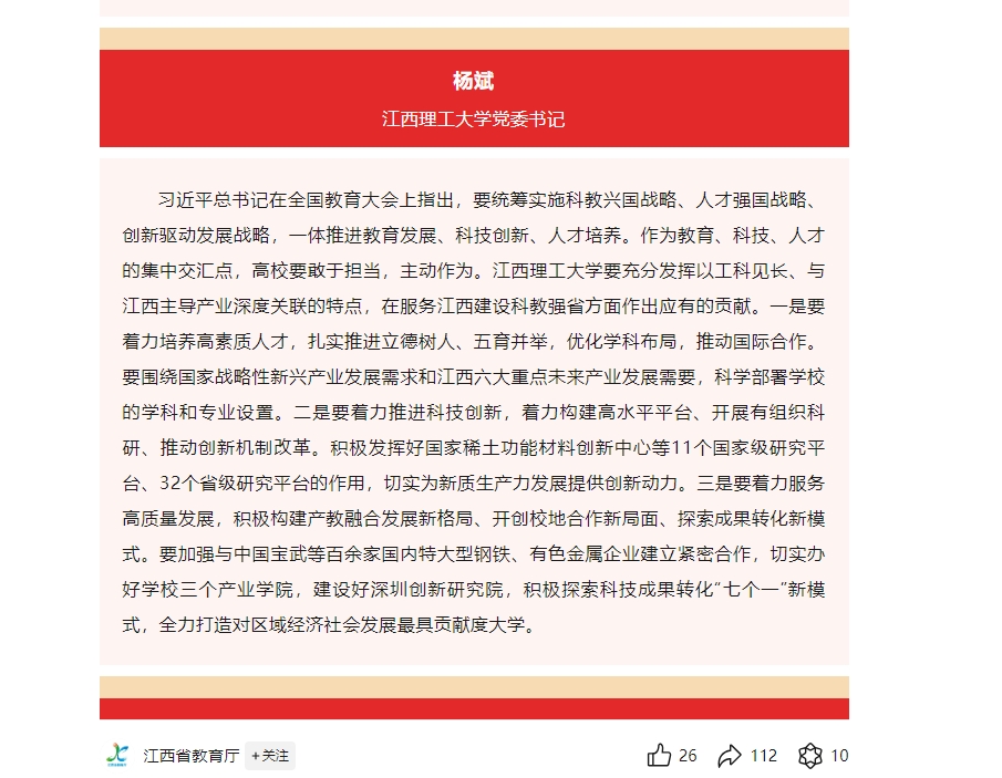 习近平总书记在全国教育大会上指出,要统筹实施科教兴国战略、人才强国战略、创新驱动发展战略,一体推进教育发展、科技创新、人才培养。作为教育、科技、人才的集中交汇点,高校要敢于担当,主动作为。江西理工大学要充分发挥以工科见长、与江西主导产业深度关联的特点,在服务江西建设科教强省方面作出应有的贡献。一是要着力培养高素质人才,扎实推进立德树人、五育并举,优化学科布局,推动国际合作。要围绕国家战略性新兴产业发展需求和江西六大重点未来产业发展需要,科学部署学校的学科和专业设置。二是要着力推进科技创新,着力构建高水平平台、开展有组织科研、推动创新机制改革。积极发挥好国家稀土功能材料创新中心等11个国家级研究平台、32个省级研究平台的作用,切实为新质生产力发展提供创新动力。三是要着力服务高质量发展,积极构建产教融合发展新格局、开创校地合作新局面、探索成果转化新模式。要加强与中国宝武等百余家国内特大型钢铁、有色金属企业建立紧密合作,切实办好学校三个产业学院,建设好深圳创新研究院,积极探索科技成果转化“七个一”新模式,全力打造对区域经济社会发展最具贡献度大学。
