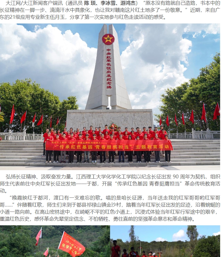 弘扬长征精神、汲取奋发力量。江西理工大学化学化工学院以纪念长征出发 90 周年为契机,组织师生代表前往中央红军长征出发地——于都,开展“传承红色基因 青春挺膺担当”革命传统教育活动。