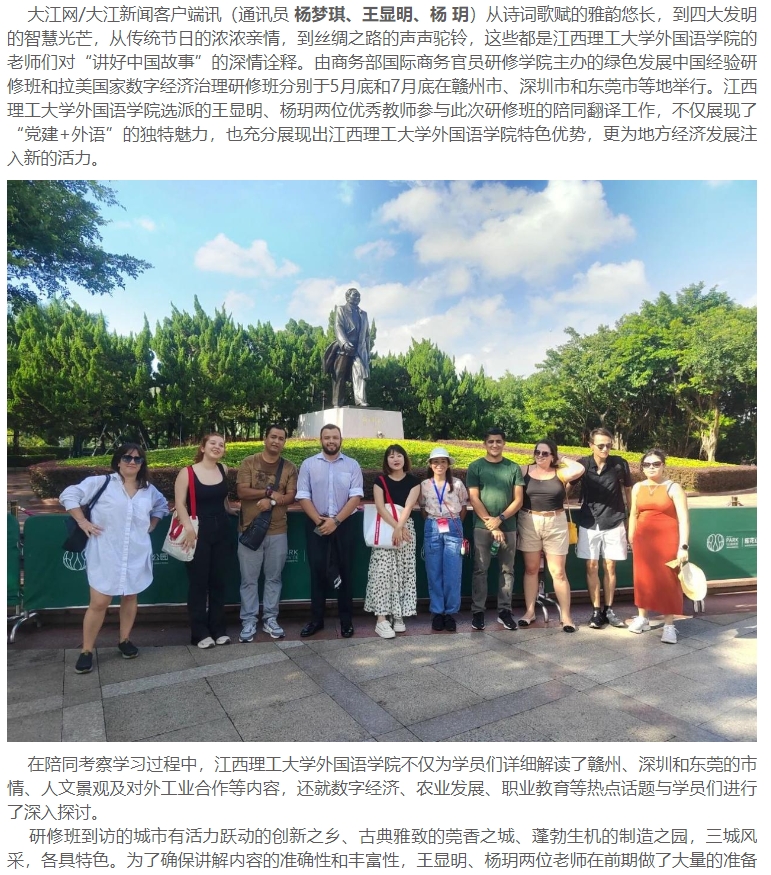 大江网/大江新闻客户端讯(通讯员杨梦琪、王显明、杨 玥)从诗词歌赋的雅韵悠长,到四大发明的智慧光芒,从传统节日的浓浓亲情,到丝绸之路的声声驼铃,这些都是江西理工大学外国语学院的老师们对“讲好中国故事”的深情诠释。由商务部国际商务官员研修学院主办的绿色发展中国经验研修班和拉美国家数字经济治理研修班分别于5月底和7月底在赣州市、深圳市和东莞市等地举行。江西理工大学外国语学院选派的王显明、杨玥两位优秀教师参与此次研修班的陪同翻译工作,不仅展现了“党建+外语”的独特魅力,也充分展现出江西理工大学外国语学院特色优势,更为地方经济发展注入新的活力。