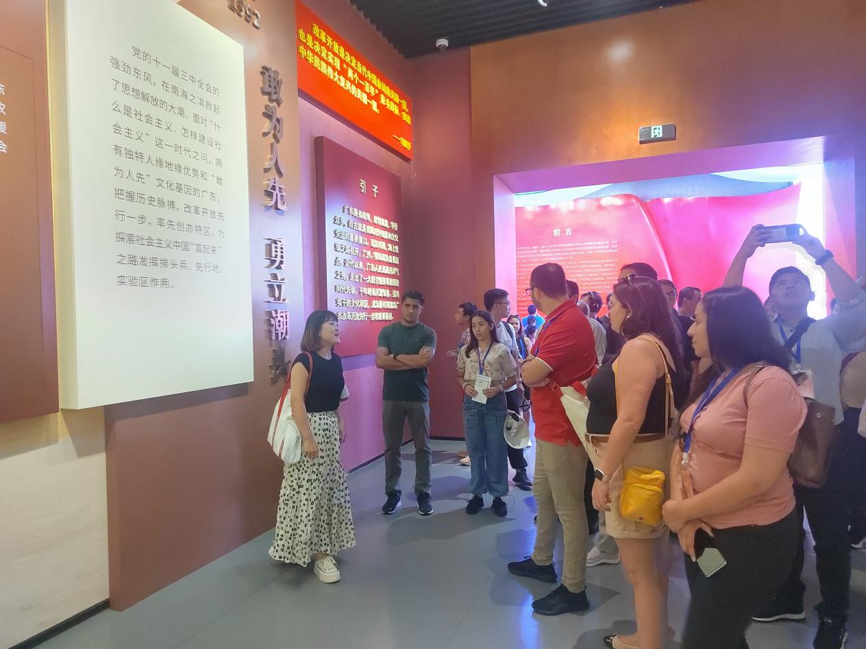 研修班到访的城市有活力跃动的创新之乡、古典雅致的莞香之城、蓬勃生机的制造之园,三城风采,各具特色。为了确保讲解内容的准确性和丰富性,王显明、杨玥两位老师在前期做了大量的准备工作,充分发挥了江西理工大学外国语学院“党建+外语”的特色和优势。同时,他们在讲述中国故事时,深入浅出,穿梭古今,赢得了研修班成员的高度赞赏。