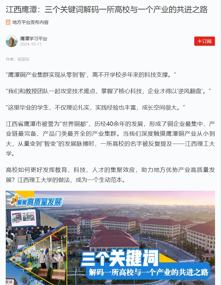 近年来,江西理工大学推动鹰潭市8家企业组建铜加工领域省协同创新体,支撑10家重要的铜企业建立市级工程技术研究中心、共建8个省级工程研究平台;学校通过技术和人才,支撑鹰潭引进总投资超50亿元的力博有色智造工业园项目落地贵溪。