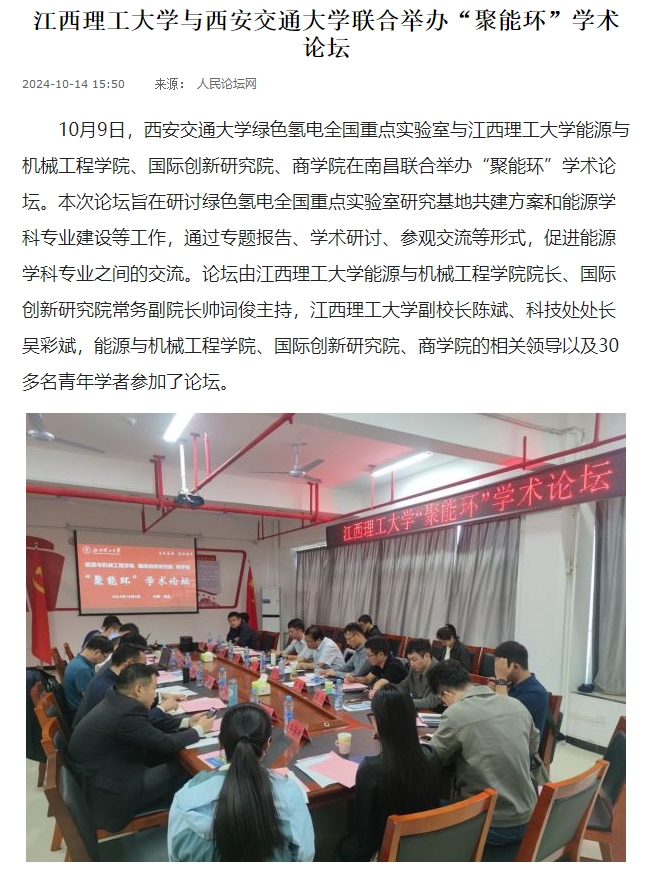 10月9日,西安交通大学绿色氢电全国重点实验室与江西理工大学能源与机械工程学院、国际创新研究院、商学院在南昌联合举办“聚能环”学术论坛。本次论坛旨在研讨绿色氢电全国重点实验室研究基地共建方案和能源学科专业建设等工作,通过专题报告、学术研讨、参观交流等形式,促进能源学科专业之间的交流。论坛由江西理工大学能源与机械工程学院院长、国际创新研究院常务副院长帅词俊主持,江西理工大学副校长陈斌、科技处处长吴彩斌,能源与机械工程学院、国际创新研究院、商学院的相关领导以及30多名青年学者参加了论坛。