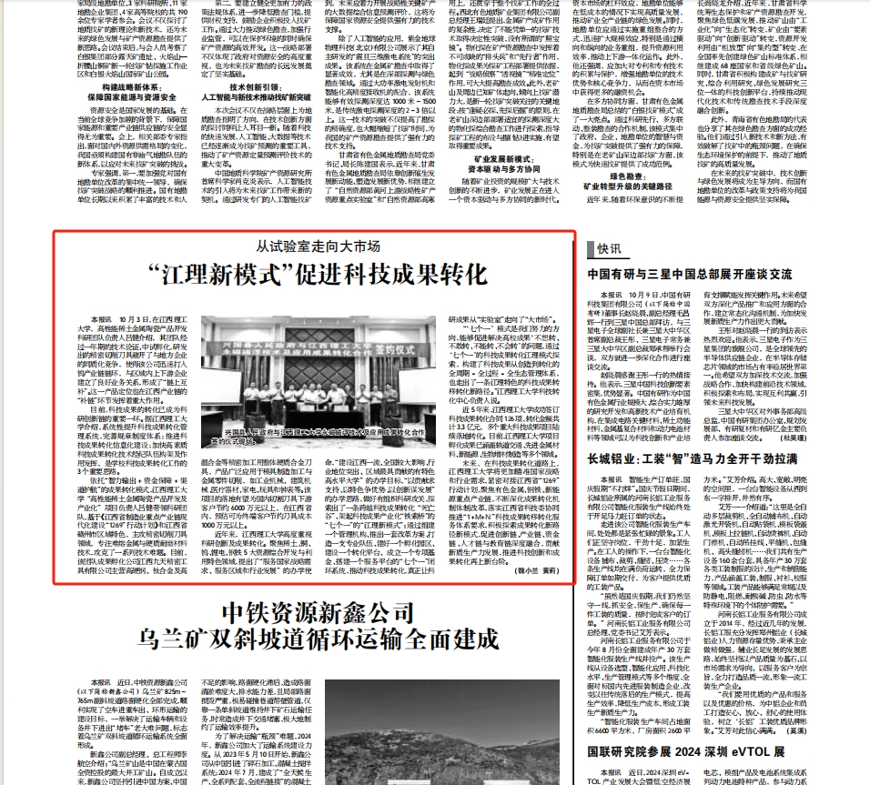 近年来,江西理工大学高度重视科研创新及成果转化。聚焦稀土、铜、钨、锂电、钢铁 5 大资源综合开发与利用特色领域,提出了“服务国家战略需求、服务区域和行业发展”的办学使命,“建设江西一流、全国较大影响、行业地位突出、区域最具贡献的有特色高水平大学”的办学目标,“以贡献求支持、以特色争优势、以创新谋发展”的办学思路,做好有组织科研攻关,探索出了一条跨越科技成果转化“死亡谷”、架起科技成果产业化“铁索桥”的“七个一”的“江理新模式”:通过组建一个管理机构、推出一套改革方案、打造一支专业队伍、建好一个孵化园区、建设一个转化平台、成立一个专项基金、搭建一个服务平台的“七个一”闭环系统,推动科技成果转化,真正让科研成果从“实验室”走向了“大市场”。