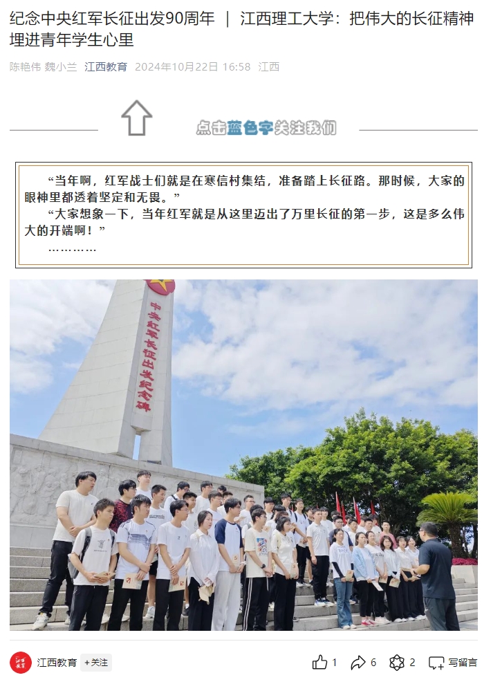 一直以来,江西理工大学充分运用VR技术,开好思政课;打造学生特色宣讲团,讲好长征故事;把课堂搬到历史发生地,开展跨越时空的对话,把伟大的长征精神埋进青年学生的心里。
