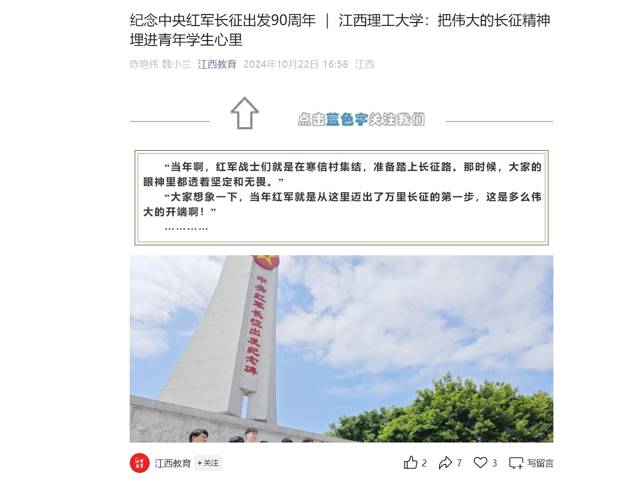 2024年暑假,在中央红军长征出发纪念碑前,江西理工大学师生用一组“跨越时空的对话”,重温峥嵘岁月,在实践中体验历史与现实的贯通、时间与空间的融合。