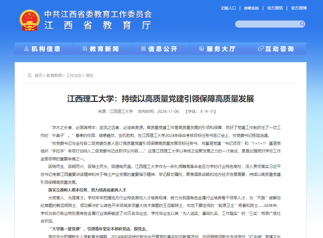 因钨而生、因铜而兴、因稀土而为、因锂电而盛。江西理工大学作为一所扎根赣南革命老区办学的行业特色高校,深入贯彻落实习近平总书记考察江西重要讲话精神和关于稀土产业发展的重要指示精神,牢记殷切嘱托,聚焦国家战略和地方经济发展需要,持续以高质量党建引领保障高质量发展。