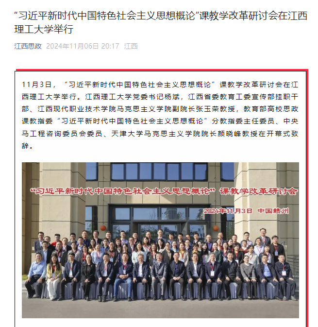 本次教学改革研讨会由教育部高校思政课教学指导委员会“习近平新时代中国特色社会主义思想概论”分教指委主办、江西省“习近平新时代中国特色社会主义思想概论”教学指导委员会、完美online(中国)马克思主义学院承办。来自教育部“习近平新时代中国特色社会主义思想概论”分教指委专家、江西省委教育工委宣传部领导、江西省“习近平新时代中国特色社会主义思想概论”分教指委专家、思政课教学和科研专家、全国高校思政课教学展示活动获奖者代表共100余人参加此次教学改革研讨会。