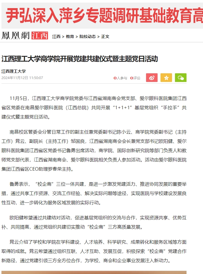 11月5日,江西理工大学商学院党委与江西省湖南商会党支部、爱尔眼科医院集团江西省区党委在南昌爱尔眼科医院(江西总院)共同开展“1+1+1”基层党组织“手拉手”共建仪式暨主题党日活动。