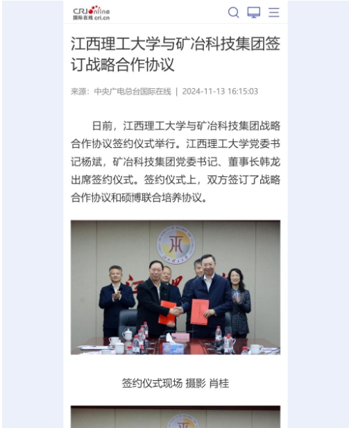 日前,江西理工大学与矿冶科技集团战略合作协议签约仪式举行。江西理工大学党委书记杨斌,矿冶科技集团党委书记、董事长韩龙出席签约仪式。签约仪式上,双方签订了战略合作协议和硕博联合培养协议。